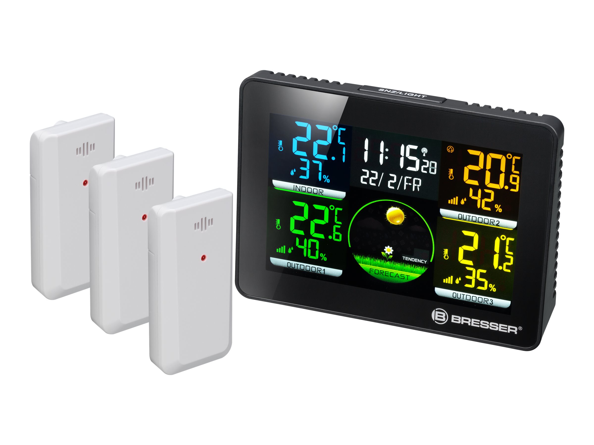 Das BRESSER Thermo Hygro Quadro NLX bietet wie Temeo Hygro Quadro die Möglichkeit an 4 unterschiedlichen Messpunkten gleichzeitig die Temperatur und Luftfeuchtigkeit zu messen. Zusätzlich wird bei diesem Gerät auch der Wettertrend, sowie Uhrzeit und Datum auf dem übersichtlich gestalteten Farbdisplay angezeigt.
